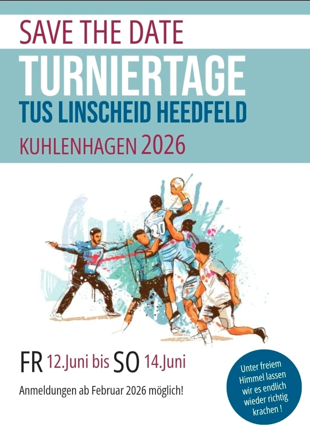 Details ansehenPicknick Kuhlenhagen 2026 12. bis 14. Juni 2026 – Schalksmühle Das legendäre Picknick Kuhlenhagen geht in die nächste Runde! Erlebt ein actiongeladenes Wochenende mit Hobby-Fußball- und Handballturnieren, einer tollen DJ-Party und einem bunten Kinderprogramm. Seid dabei, wenn sich die besten Teams messen und das Picknick-Kuhlenhagen zu einem unvergesslichen Event wird! Anmeldungen für alle Turniere sind über den Reiter „Picknick-Kuhlenhagen“ auf der Homepage möglich.